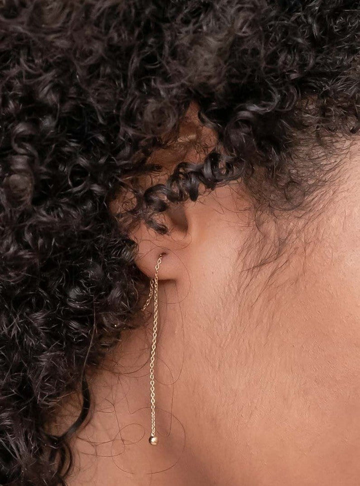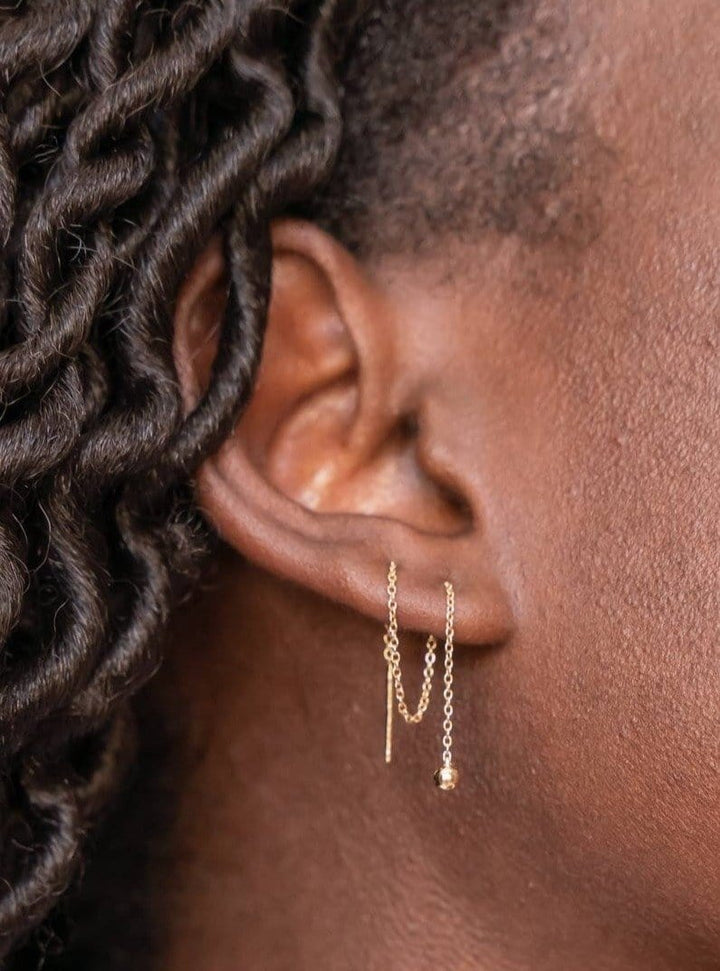 The Ball & Chain Earrings are lightweight, comfortable, & edgy. This simple, yet elegant design allows you to wear them through one piercing or two (or even three!) for different looks. Sold as a pair.